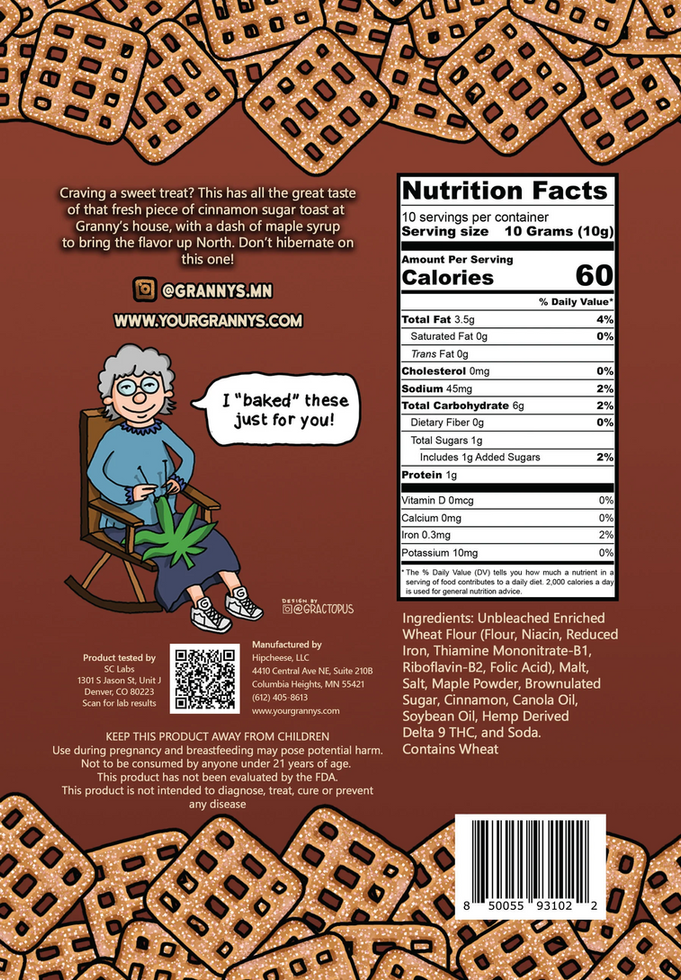 Ingredients: Unbleached Enriched Wheat Flour (Flour, Niacin, Reduced Iron, Thiamine Mononitrate-B1, Riboflavin-B2, Folic Acid), Malt, Salt, Maple Powder, Brownulated Sugar, Cinnamon, Canola Oil, Soybean Oil, Hemp-Derived Delta 9 THC, and Soda.