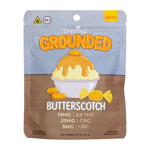 Unwind’s Grounded Caramel delivers rich, creamy butterscotch flavor with a hint of nostalgia; perfectly paired with a balanced blend of THC, CBG, and CBC for an easygoing daytime experience.